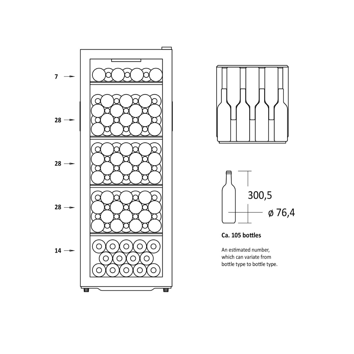 Scandomestic WC105BG er et stilfuldt fritstående vinkøleskab med elegant sort glasdør, integreret håndtag og LED‑belysning, der giver flot præsentation af dine vine. Skabet har elektronisk temperaturstyring med digitalt display og kan justeres mellem 5 °C og 20 °C, så det passer til både rød‑ og hvidvine. Med plads til op til 105 flasker fordelt på 4 bøgetræshylder får du masser af opbevaringsplads i en enkel og moderne løsning, der er perfekt til hjemmet eller barområdet.