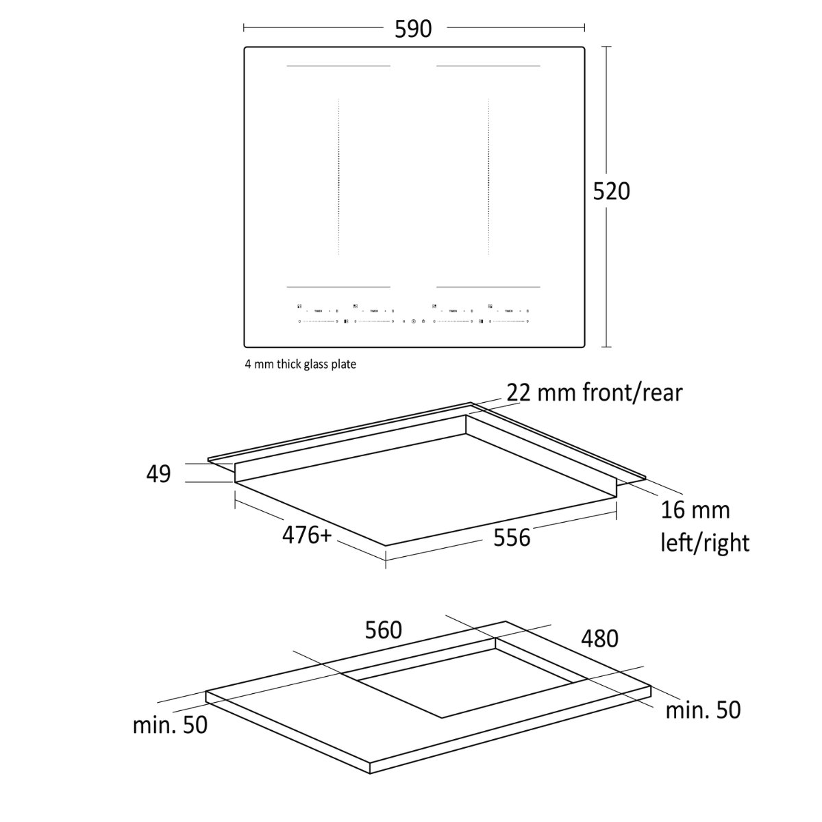 - Mål (HxBxD): 55 x 590 x 520 mm