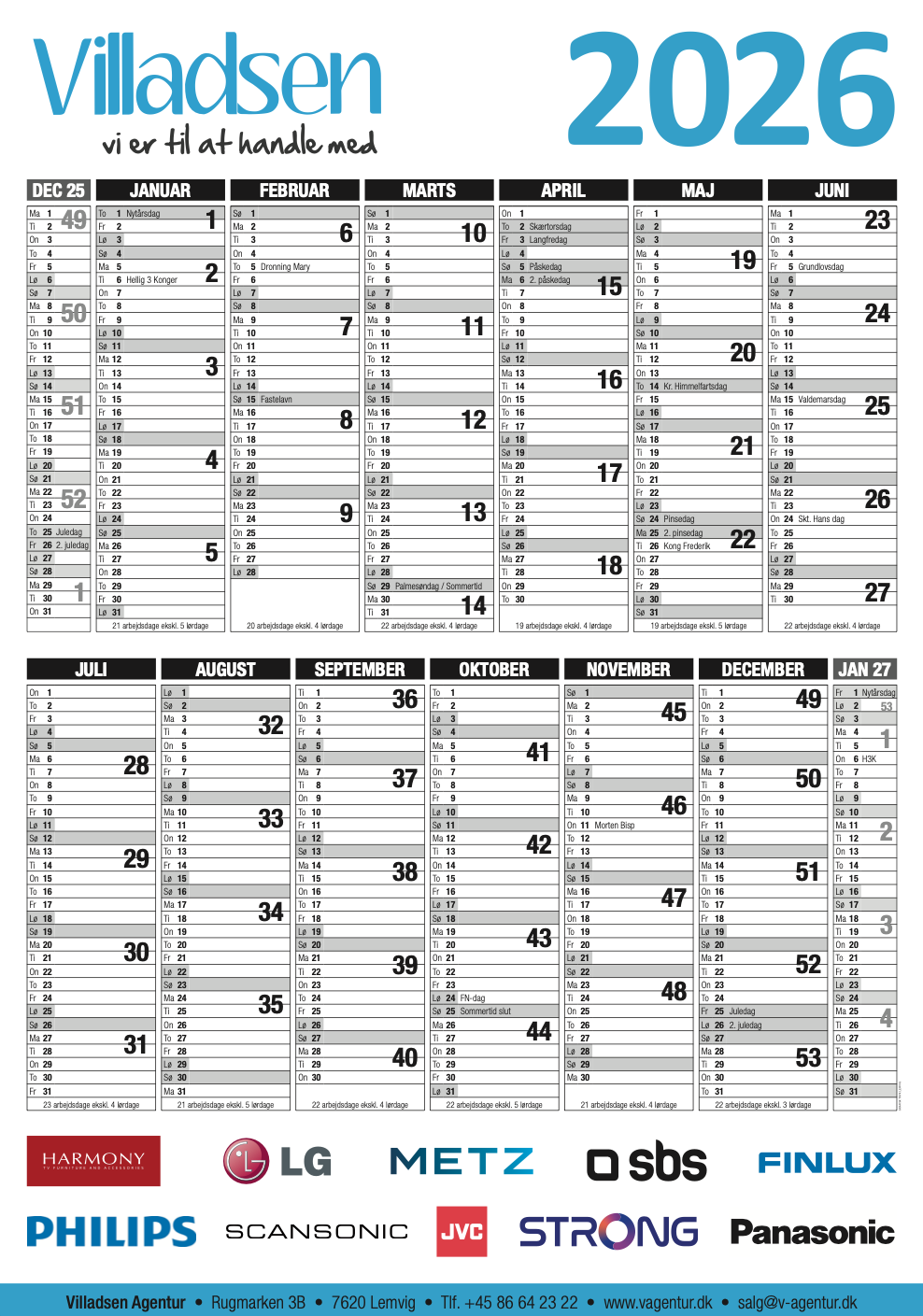• Inkluderer ugenummer, danske helligedage og antal arbejdsdage og antal lørdage per måned